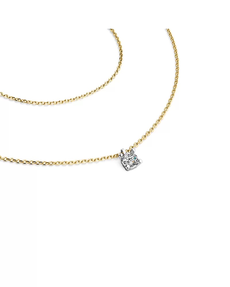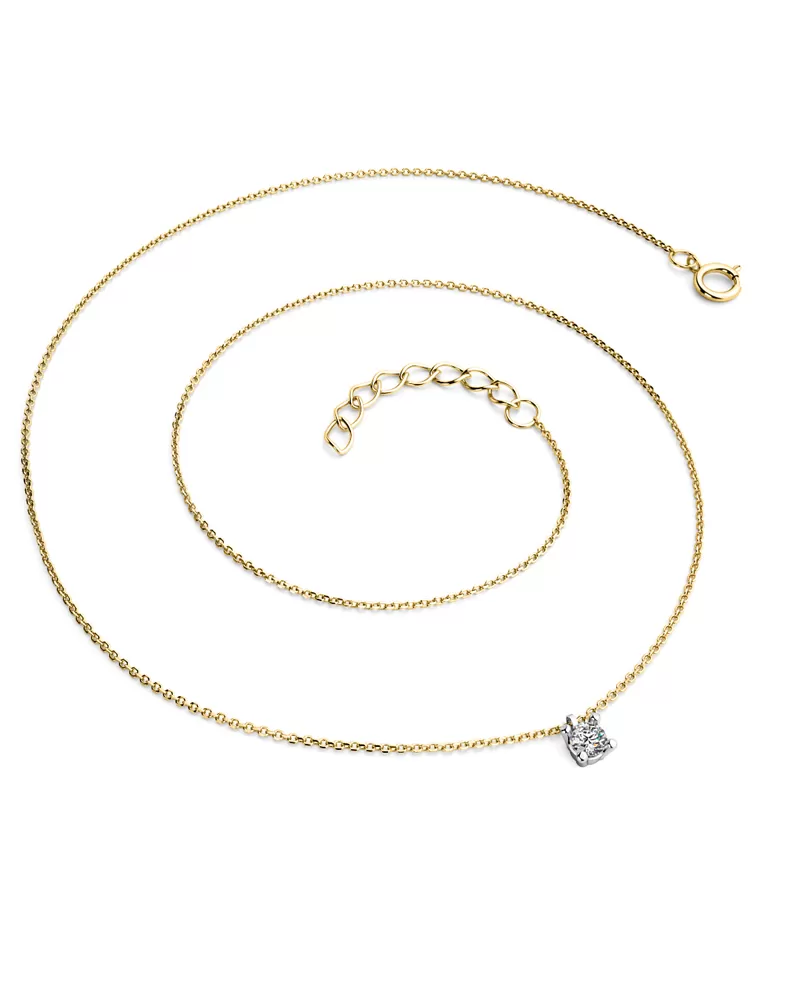 Jednoduchý elegantní náhrdelník je vyrobený ze žlutého a bílého čtrnáctikarátového zlata - 585/1000 a tvoří ho řetízek typu anker s lesklými facetami na každém očku. Facety jsou zhotoveny diamantovým nástrojem, který dodává vzniklým facetám maximální lesk. Na řetízku je zavěšen v pevné čtyřkrapnové korunce jeden kulatý diamant briliantového brusu, který zajišťuje maximální brilanci vybroušených facet, dokonale odráží světlo a neuvěřitelné září z každého úhlu pohledu! Vsazování diamantů provádějí naši nejzkušenější mistři zlatníci ručně pod mikroskopem s přesností na 0,01mm a proto nehrozí vypadnutí kamínků jako to bývá u strojně vyráběných šperků.