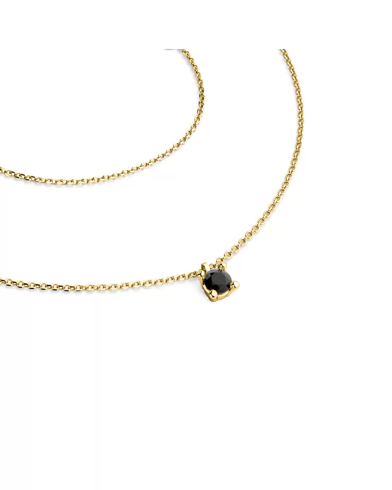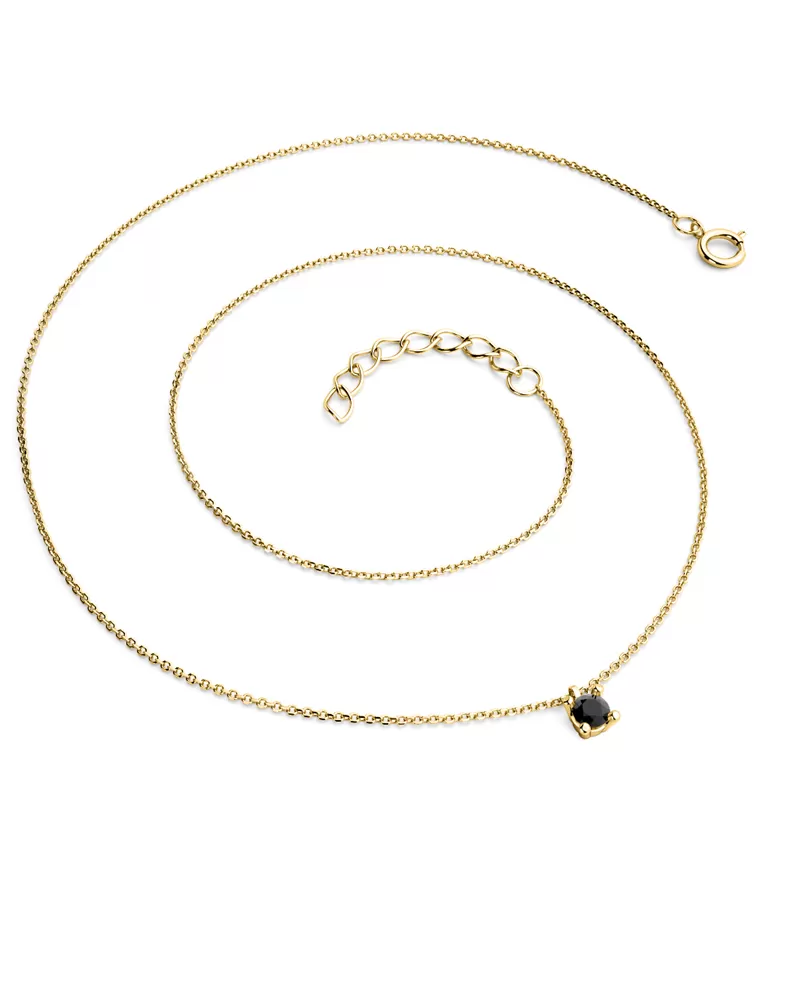 Jednoduchý elegantní náhrdelník je vyrobený ze žlutého čtrnáctikarátového zlata - 585/1000 a tvoří ho řetízek typu anker s lesklými facetami na každém očku. Facety jsou zhotoveny diamantovým nástrojem, který dodává vzniklým facetám maximální lesk. Na řetízku je zavěšen v pevné čtyřkrapnové korunce jeden kulatý černý diamant briliantového brusu. Vsazování diamantů provádějí naši nejzkušenější mistři zlatníci ručně pod mikroskopem s přesností na 0,01mm a proto nehrozí vypadnutí kamínků jako to bývá u strojně vyráběných šperků.