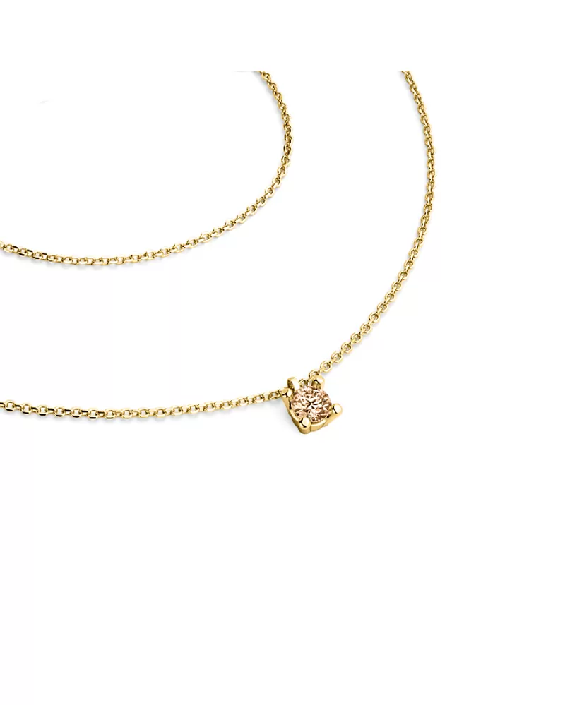 Jednoduchý elegantní náhrdelník je vyrobený ze žlutého čtrnáctikarátového zlata - 585/1000 a tvoří ho řetízek typu anker s lesklými facetami na každém očku. Facety jsou zhotoveny diamantovým nástrojem, který dodává vzniklým facetám maximální lesk. Na řetízku je zavěšen v pevné čtyřkrapnové korunce jeden kulatý diamant barvy champagne briliantového brusu, který zajišťuje maximální brilanci vybroušených facet, dokonale odráží světlo a krásně září z každého úhlu pohledu! Vsazování diamantů provádějí naši nejzkušenější mistři zlatníci ručně pod mikroskopem s přesností na 0,01mm a proto nehrozí vypadnutí kamínků jako to bývá u strojně vyráběných šperků.