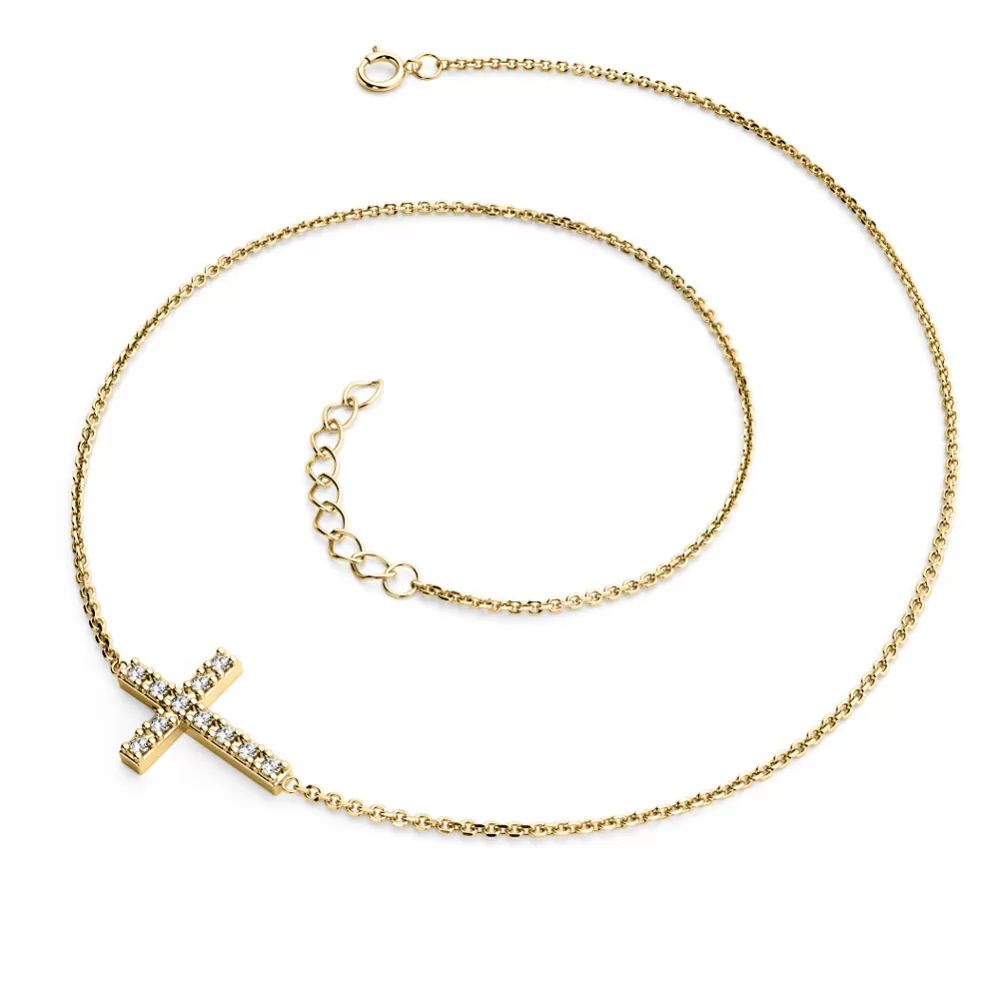 Náhrdelník je vyrobený zo žltého štrnásťkarátového zlata - 585/1000 a tvorí ho retiazka typu anker s lesklými facetami na každom očku. Facety sú zhotovené diamantovým nástrojom, ktorý dodáva vzniknutým facetám krásny lesk a ligot. Uprostred retiazky je kríž. Celý náhrdelník je v lesklej povrchovej úprave. V krížiku je vsadených jedenásť okrúhlych diamantov briliantového brusu, ktorý zaisťuje maximálnu brilanciu vybrúsených facet diamantov, dokonale odráža svetlo a krásne žiari z každého uhla pohľadu! Diamanty sú vsadené do krapien. Vsadzovanie diamantov vykonávajú naši najskúsenejší majstri zlatníci ručne pod mikroskopom s presnosťou na 0,01mm a preto nehrozí vypadnutie kamienkov ako to býva pri strojne vyrábaných šperkoch.