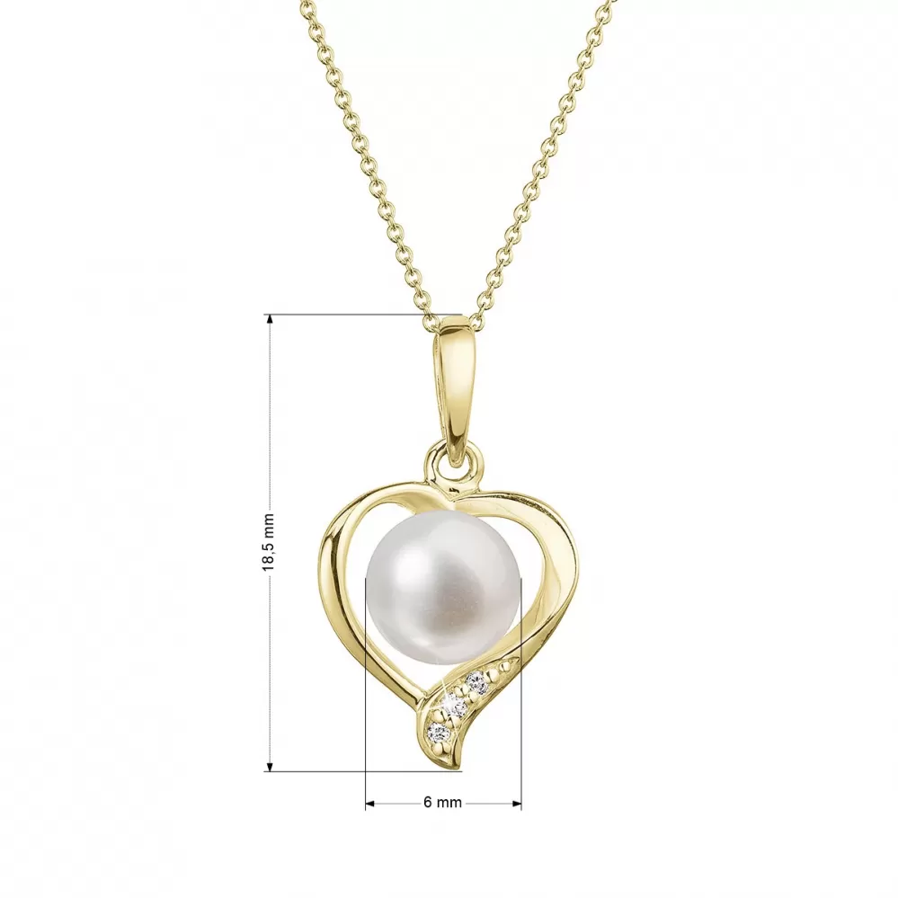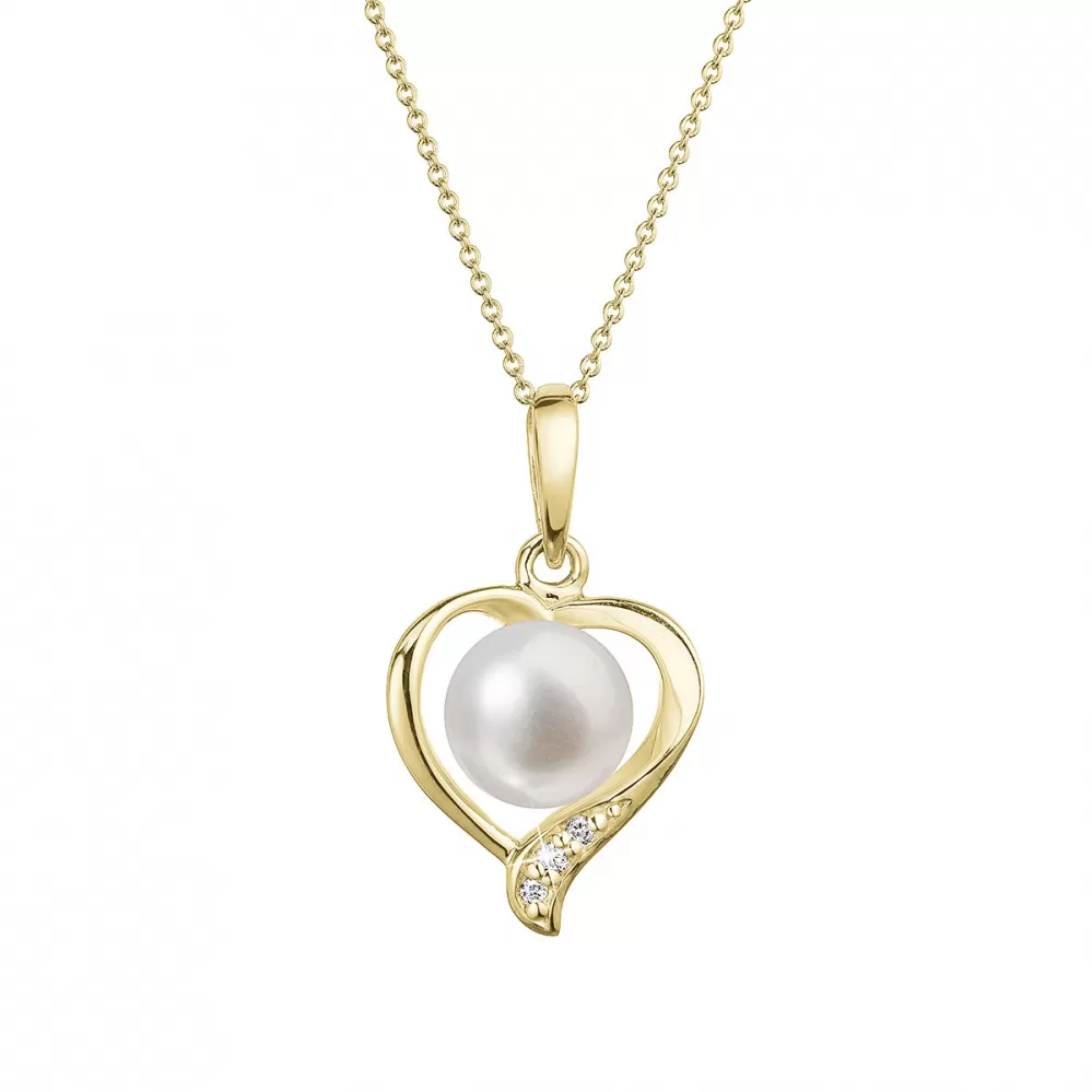 Jemný náhrdelník s perlou bielej rieky v zlatom srdci s brilantmi je krásny klenot pre lásku.