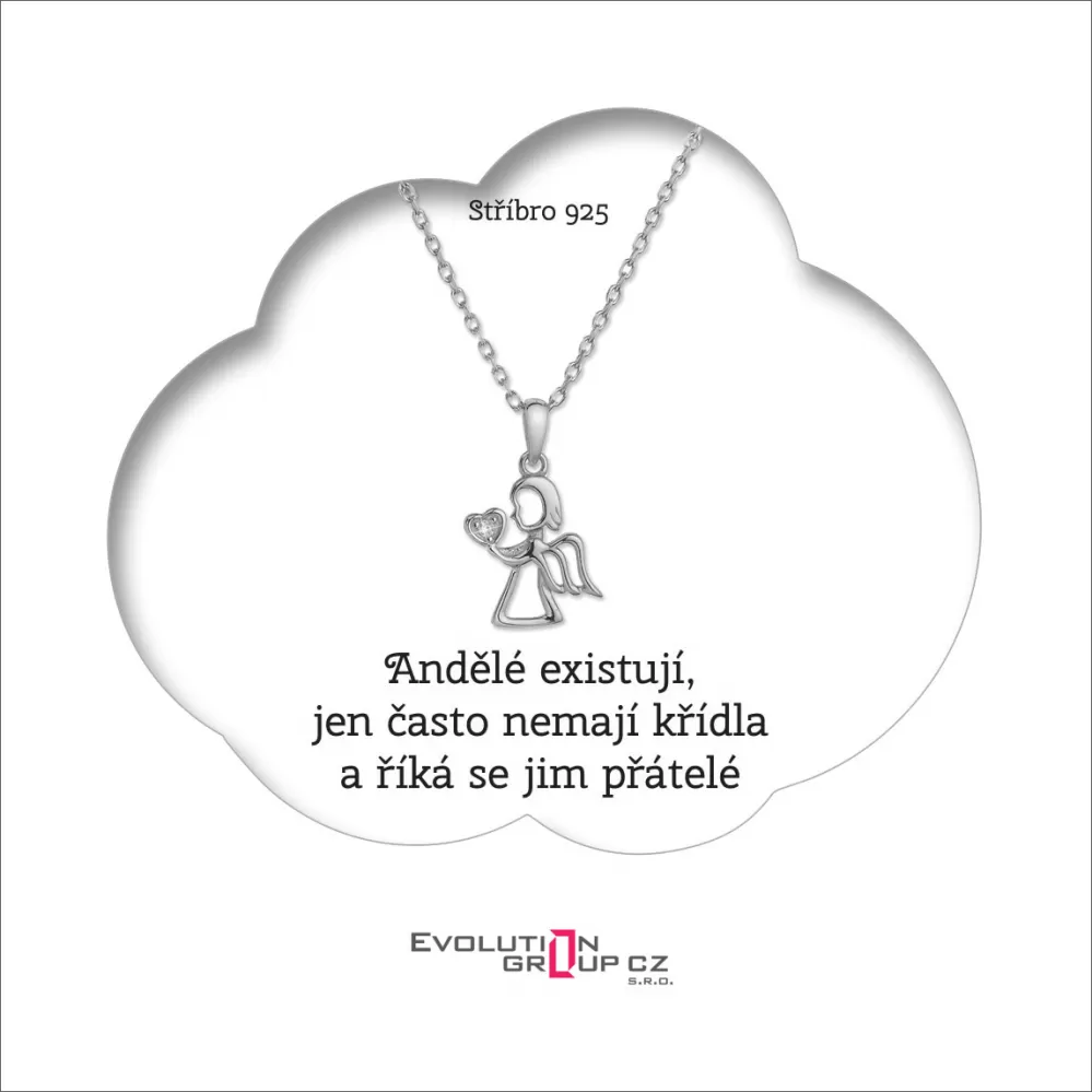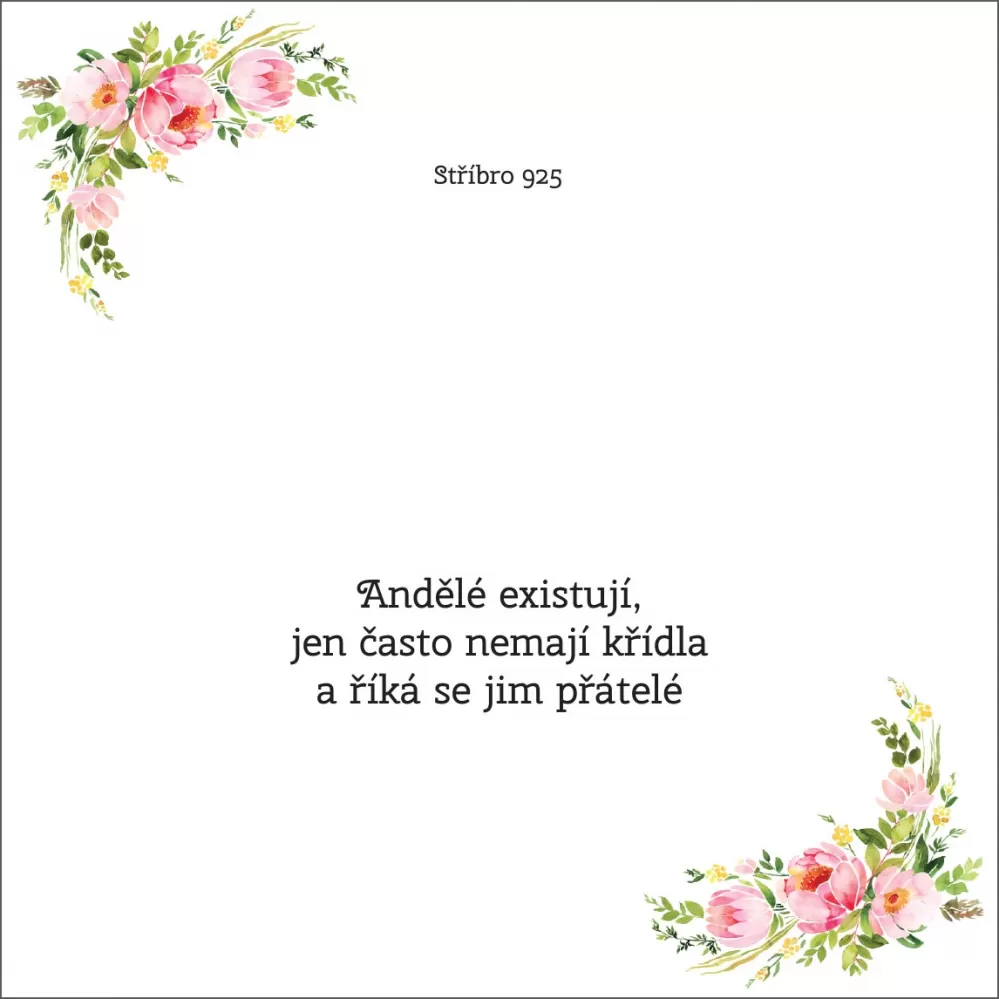 Darčekový set obsahuje strieborný náhrdelník anjel držiaci srdiečko zo zirkónu. Je zavesený na darčekovej karte s nádherným prianím „Anjeli existujú, len často nemajú krídla a hovorí sa im priatelia“. Krásny nežný darček pre kamarátku, ktorá je vašim strážnym anjelom.