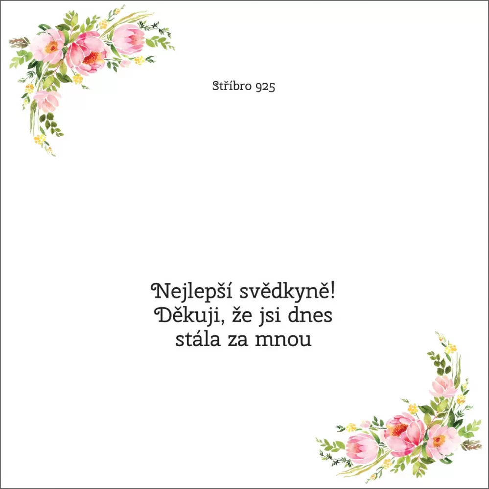 Darčekový set obsahuje strieborný náhrdelník s 9 malými okrúhlymi zirkónmi, ktorý je zavesený na darčekovej karte s nádherným prianím „Najlepšia svedkyňa! Ďakujem, že si dnes stála za mnou“. Krásny symbolický darček pre vašu svedkyňu, ktorá je vašou oporou a pomocnou rukou vo svadobný deň.