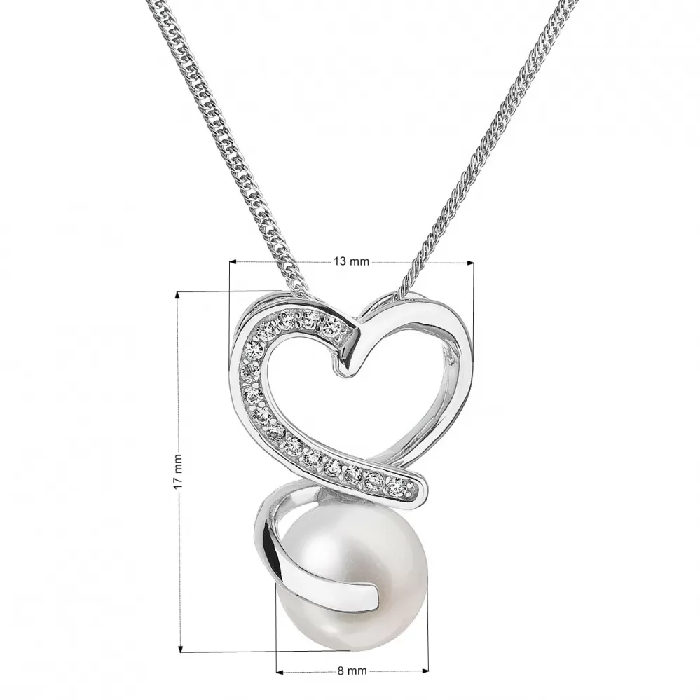 Retiazka je vyrobená zo striebra rýdzosti 925/1000 vrátane povrchovej úpravy ródiom a zaujme predovšetkým svojim originálnym príveskom v tvare srdca. To je dozdobené 15 trblietavými zirkónmi a bielou riečnou perlou najvyššej kvality AAA. Do náhrdelníka nie je pridaný žiadny nikel, a tak je vhodný aj pre alergikov.
