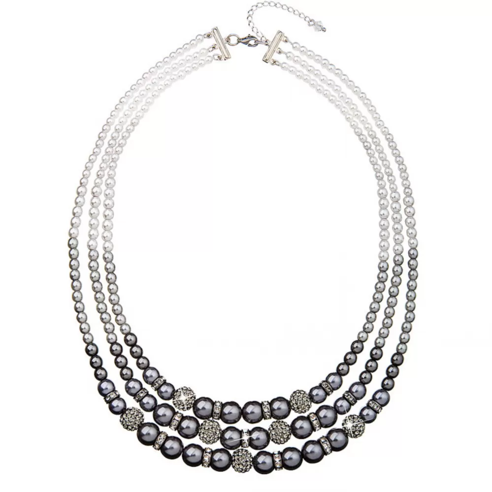 Trojitý perlový náhrdelník 32010.3 v dĺžke 45 cm pozostáva z 3 radov šedých a bielych syntetických perál rôznych veľkostí, medzi ktorými rutínske kruhy vysadili kryštály Swarovski. Kryštály sú biele. Na upevnenie výstrihu 925/1000 , ktoré Rhodius upravil Rhodius, sa použil na upevnenie výstrihu. Rodium chráni striebro pred sčernením, žltnutím a škrabancami. Náhrdelník je tiež vhodný pre alergických, pretože neobsahuje nikel.