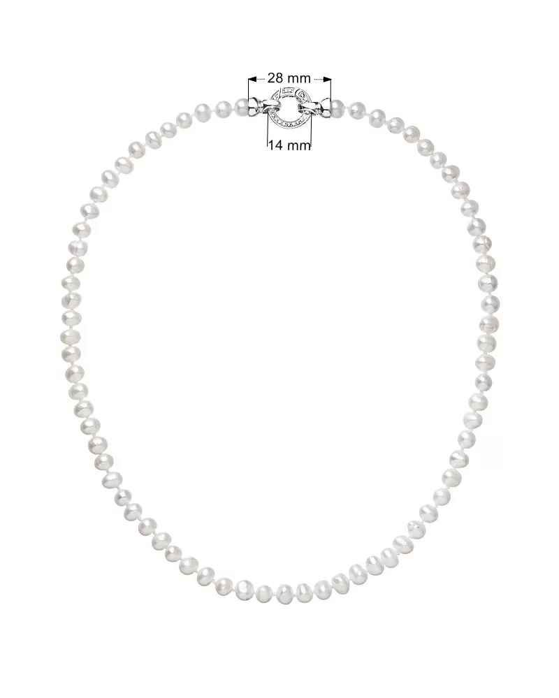 zaistená uzlíkovou väzbou, a tak sa pri nechcenom pretrhnutí náhrdelníka nestane, že sa vám perly rozkotúľajú na všetky strany. Zaujímavo riešené okrúhle strieborné zapínanie zdobené niekoľkými trblietavými zirkónmi dodáva náhrdelníku na elegancii. Striebro použité na zapínanie má rýdzosť 925/1000 a ródiovú povrchovú úpravu. Náhrdelník neobsahuje nikel, a tak ho môžu bez obáv nosiť aj alergici.