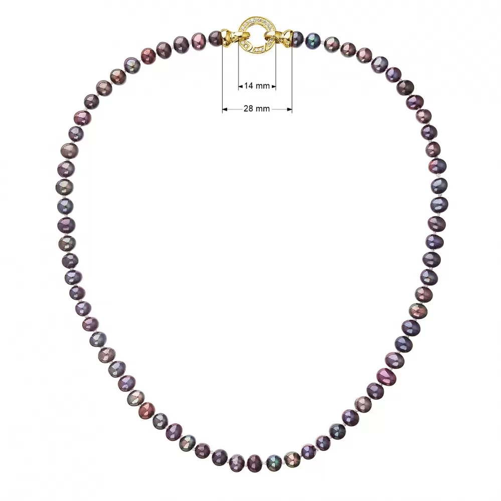 Perlový náhrdelník 22001.3 s celkovou dĺžkou 45 cm sa skladá z oválnych pravých riečnych perál v tmavo modrofialovej farbe. Každá perla jezaistená uzlíkovou väzbou, a tak sa pri nechcenom pretrhnutí náhrdelníka nestane, že sa vám perly rozkotúľajú na všetky strany. Zaujímavo riešené okrúhle pozlátené strieborné zapínanie zdobené niekoľkými trblietavými zirkónmi dodáva náhrdelníku na elegancii. Striebro použité na zapínanie má rýdzosť 925/1000 a je pozlátené. Náhrdelník neobsahuje nikel, a tak ho môžu bez obáv nosiť aj alergici.
