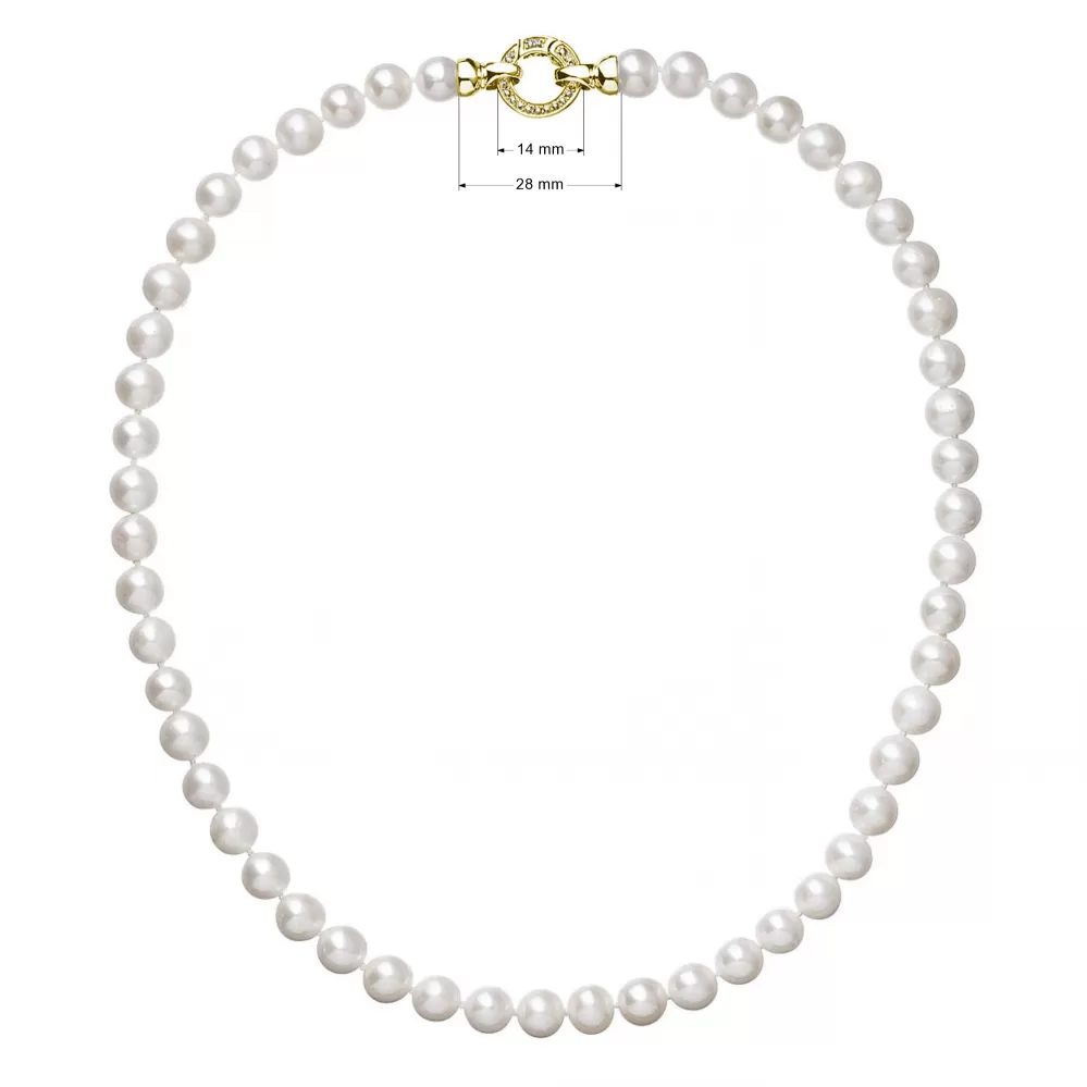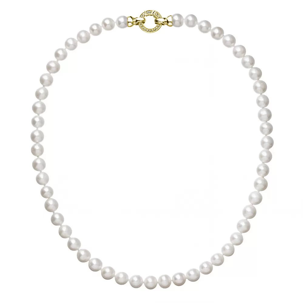 Perlový náhrdelník 22003.1 o celkovej dĺžke 45 cm   v bielej farbe. Každá perla jezaistená uzlíkovou väzbou, a tak sa pri nechcenom pretrhnutí náhrdelníka nestane, že sa vám perly rozkotúľajú na všetky strany. Zaujímavo riešené okrúhle pozlátené strieborné zapínanie zdobené niekoľkými trblietavými zirkónmi dodáva náhrdelníku na elegancii. Striebro použité na zapínanie má rýdzosť 925/1000 a povrchovú úpravu zlatom. Náhrdelník neobsahuje nikel, a tak ho môžu bez obáv nosiť aj alergici.