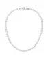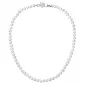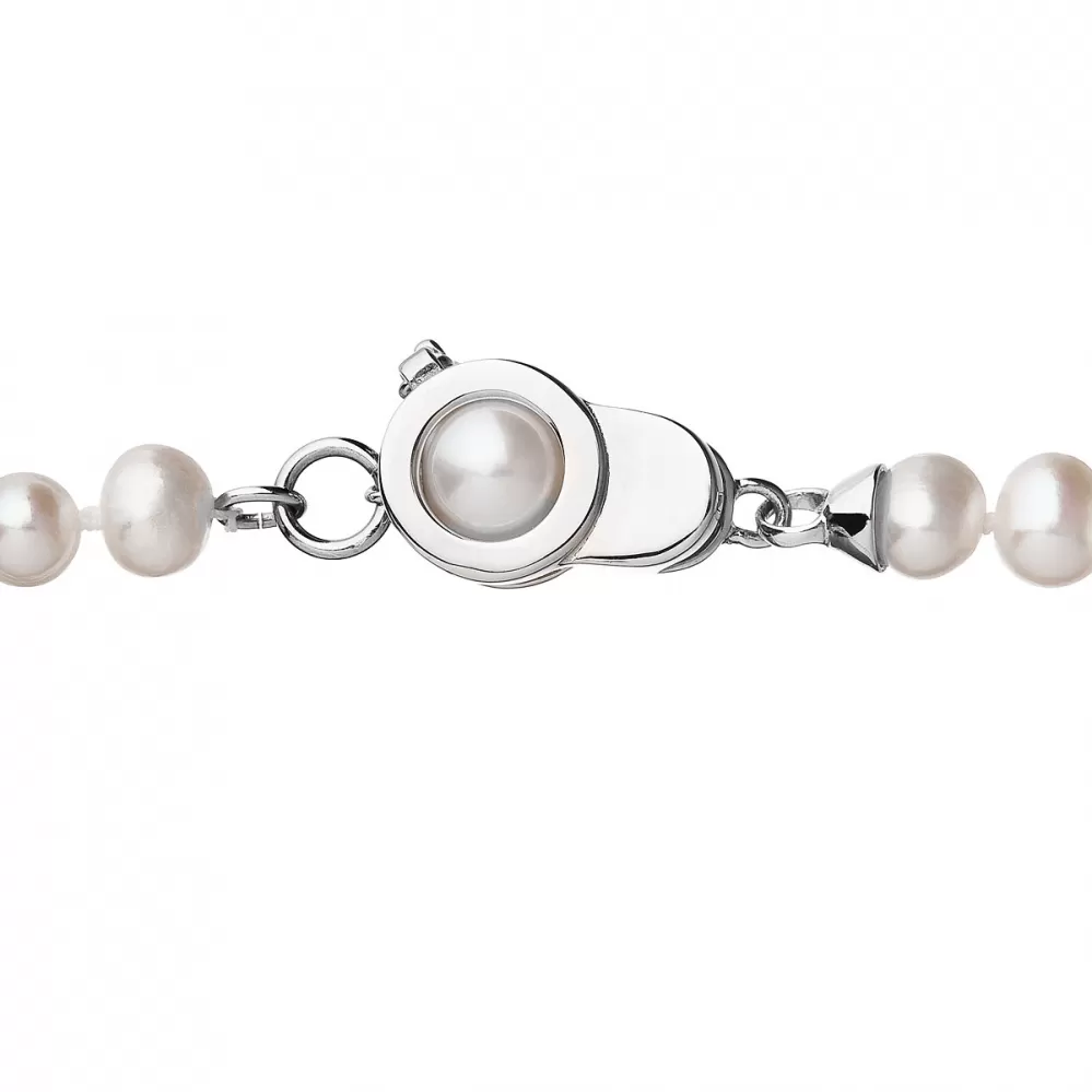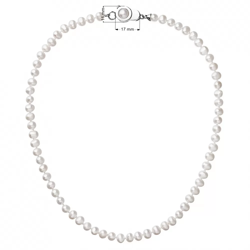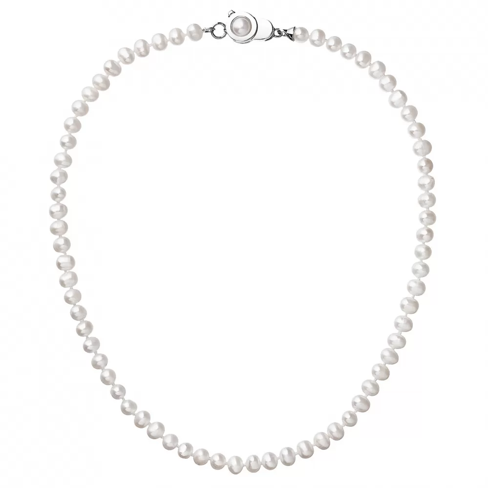 Perlový náhrdelník 22006.1 o celkovej dĺžke 45 cm sa skladá z pravých riečnych perál v bielej farbe. Každá perla je zaistená uzlíkovou väzbou, a tak sa pri nechcenom pretrhnutí náhrdelníka nestane, že sa vám perly rozkotúľajú na všetky strany. Jedna perlička navyše sa ešte ukrýva v zaujímavo riešenom striebornom zapínaní s bezpečnostnou poistkou. Striebro použité na zapínanie náhrdelníka má rýdzosť 925/1000 a ródiovú povrchovú úpravu. Náhrdelník neobsahuje nikel, a tak ho môžu obliecť aj alergici.
