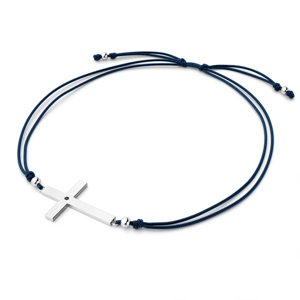 Náramek je vyroben ze šňůrky modré barvy, křížku a kuliček z bílého čtrnáctikarátového zlata - 585/1000. V křížku je vsazen jeden kulatý černý… Celý popis