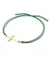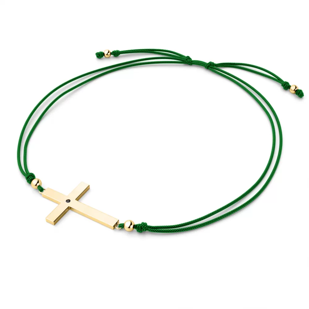 Náramek je vyroben ze šňůrky zelené barvy, křížku a kuliček ze žlutého čtrnáctikarátového zlata - 585/1000. V křížku je vsazen jeden kulatý černý diamant vybroušený briliantovým brusem. Diamant je zatepaný "na hladko" přímo do kříže. Vsazování diamantů provádějí naši nejzkušenější mistři zlatníci ručně pod mikroskopem s přesností na 0,01mm a proto nehrozí vypadnutí kamínků jako to bývá u strojně vyráběných šperků.