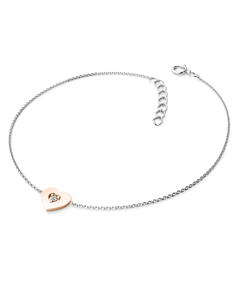 Chcete Vaši milé či blízké osobě udělat radost s něčím, co nikdo jiný nemá? Kupte jí tento náramek z bílého a růžového čtrnáctikarátového zlata 585/1000 s diamantem! Náramek tvoří řetízek typu anker s lesklými facetami na každém očku a se srdíčkem uprostřed. Srdce je symbolem lásky, takže pokud chcete svou milou zaujmout a vyznat jí lásku, nebo své blízké osobě ukázat, jak ji máte rádi a záleží vám na ni, tento náramek je přesně to, co hledáte! V srdíčku je vsazen jeden kulatý diamant, vybroušený kulatým briliantovým brusem, který zajišťuje maximální brilanci vybroušených facet ze všech úhlů pohledu! Vsazování diamantů provádějí naši nejzkušenější mistři zlatníci ručně pod mikroskopem s přesností na 0,01mm a proto nehrozí vypadnutí diamantů jako to bývá u strojně vyráběných šperků.