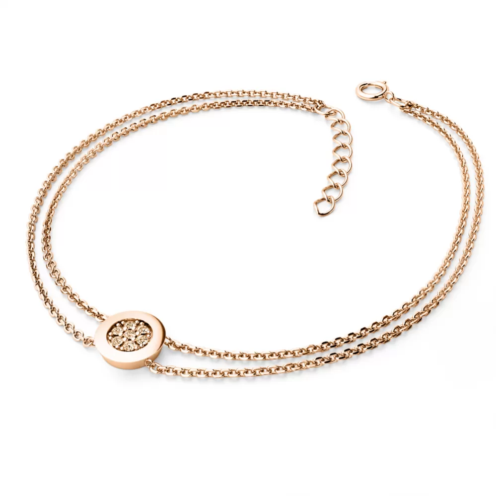 Chcete Vaši milé či blízké osobě udělat radost s něčím, co nikdo jiný nemá? Kupte jí tento náramek z růžového čtrnáctikarátového zlata 585/1000 s diamanty! Náramek tvoří dva řetízky typu anker s lesklými facetami na každém očku a s kroužkem uprostřed. V kroužku je vsazeno sedm kulatých diamantů barvy Champagne, vybroušených kulatým briliantovým brusem, který zajišťuje maximální brilanci vybroušených facet ze všech úhlů pohledu! Vsazování diamantů provádějí naši nejzkušenější mistři zlatníci ručně pod mikroskopem s přesností na 0,01mm a proto nehrozí vypadnutí diamantů jako to bývá u strojně vyráběných šperků.