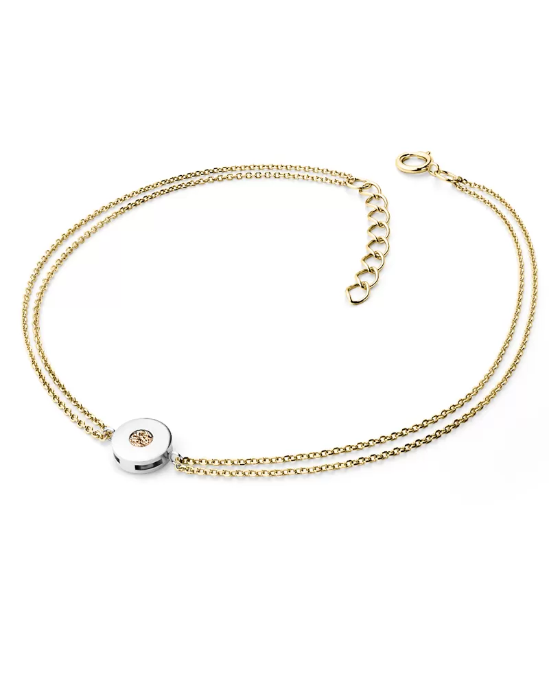 S tímto náramkem budete mít zaručeně úspěch! Tento elegantní náramek je vyroben v kombinaci žlutého a bílého čtrnáctikarátového zlata - 585/1000 v lesklé povrchové úpravě. Skládá se z dvojitého řetízku typu anker, který má facetované očka - facety jsou zhotoveny diamantovým nástrojem, který dodává vzniklým facetám maximální lesk, díky kterému dokonale odráží světlo a mají krásnou brilanci ze všech úhlů pohledu! Uprostřed řetízků je v obrubě zatepán "na hladko" jeden kulatý diamant barvy Champagne vybroušený briliantovým brusem, který zajišťuje maximální brilanci vybroušených facet! Vsazování diamantů provádějí naši nejzkušenější mistři zlatníci ručně pod mikroskopem s přesností na 0,01mm a proto nehrozí vypadnutí kamínků jako to bývá u strojně vyráběných šperků.