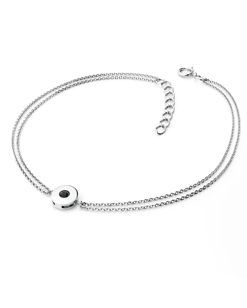 S tímto náramkem budete mít zaručeně úspěch! Tento elegantní náramek je vyroben z bílého čtrnáctikarátového zlata - 585/1000 v lesklé povrchové úpravě. Skládá se z dvojitého řetízku typu anker, který má facetované očka - facety jsou zhotoveny diamantovým nástrojem, který dodává vzniklým facetám maximální lesk, díky kterému dokonale odráží světlo a mají krásnou brilanci ze všech úhlů pohledu! Uprostřed řetízků je v obrubě zatepán "na hladko" jeden kulatý diamant černé barvy vybroušený briliantovým brusem. Vsazování diamantů provádějí naši nejzkušenější mistři zlatníci ručně pod mikroskopem s přesností na 0,01mm a proto nehrozí vypadnutí kamínků jako to bývá u strojně vyráběných šperků.