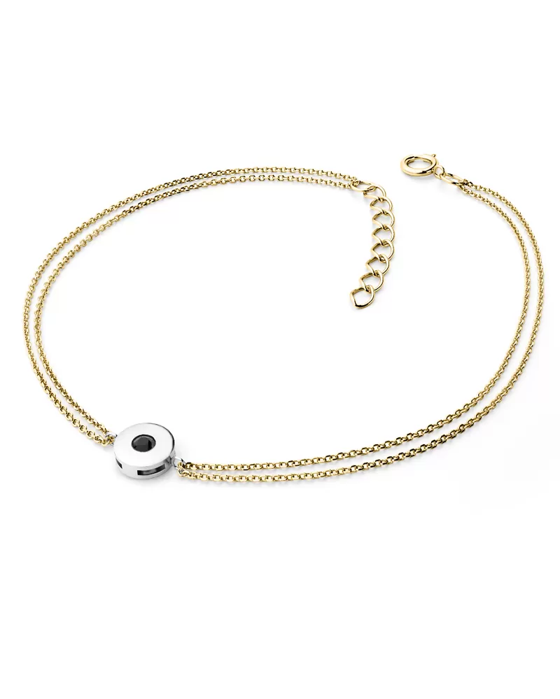 S tímto náramkem budete mít zaručeně úspěch! Tento elegantní náramek je vyroben v kombinaci žlutého a bílého čtrnáctikarátového zlata - 585/1000 v lesklé povrchové úpravě. Skládá se z dvojitého řetízku typu anker, který má facetované očka - facety jsou zhotoveny diamantovým nástrojem, který dodává vzniklým facetám maximální lesk, díky kterému dokonale odráží světlo a mají krásnou brilanci ze všech úhlů pohledu! Uprostřed řetízků je v obrubě zatepán "na hladko" jeden kulatý diamant černé barvy vybroušený briliantovým brusem. Vsazování diamantů provádějí naši nejzkušenější mistři zlatníci ručně pod mikroskopem s přesností na 0,01mm a proto nehrozí vypadnutí kamínků jako to bývá u strojně vyráběných šperků.