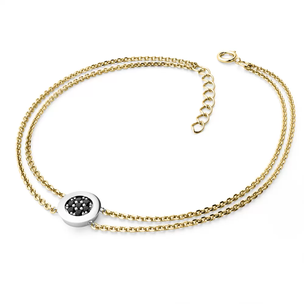 Chcete Vaši milé či blízké osobě udělat radost s něčím, co nikdo jiný nemá? Kupte jí tento náramek v kombinaci žlutého a bílého čtrnáctikarátového zlata 585/1000 s diamanty! Náramek tvoří dva řetízky typu anker s lesklými facetami na každém očku a s kroužkem uprostřed. V kroužku je vsazeno sedm kulatých černých diamantů, vybroušených kulatým briliantovým brusem! Vsazování diamantů provádějí naši nejzkušenější mistři zlatníci ručně pod mikroskopem s přesností na 0,01mm a proto nehrozí vypadnutí diamantů jako to bývá u strojně vyráběných šperků.