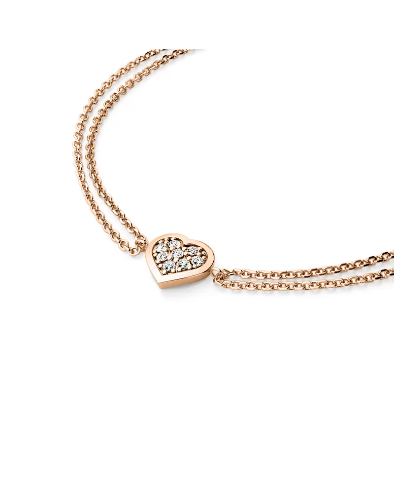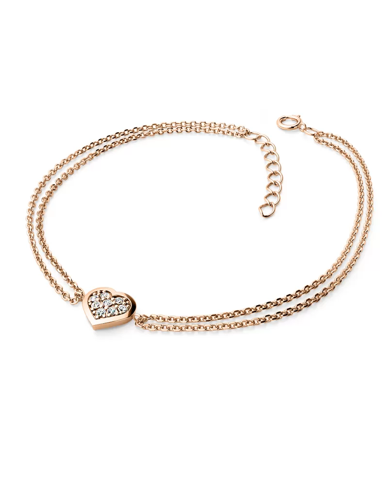 Chcete vašej milej či blízkej osobe urobiť radosť s niečím, čo nikto iný nemá? Kúpte jej tento náramok z ružového štrnásťkarátového zlata 585/1000 s diamantmi! Náramok tvorí dve spojené retiazky typu anker s lesklými facetami na každom očku, so srdiečkom uprostred. Srdce je symbolom lásky, takže ak chcete svoju milú zaujať a vyznať jej lásku, alebo svojej blízkej osobe ukázať, ako ju máte radi a záleží vám na ňu, tento náramok je presne to, čo hľadáte! V srdiečku je vsadených osem okrúhlych diamantov, vybrúsených okrúhlym briliantovým brusom, ktorý zaisťuje maximálnu brilanciu vybrúsených facet zo všetkých uhlov pohľadu! Vsadzovanie diamantov vykonávajú naši najskúsenejší majstri zlatníci ručne pod mikroskopom s presnosťou na 0,01 mm a preto nehrozí vypadnutie diamantov ako to býva pri strojne vyrábaných šperkoch. Vďaka skladbe a štýlovo čistému vsadeniu diamantov, náramok vyniká krásnou brilanciou kameňov!