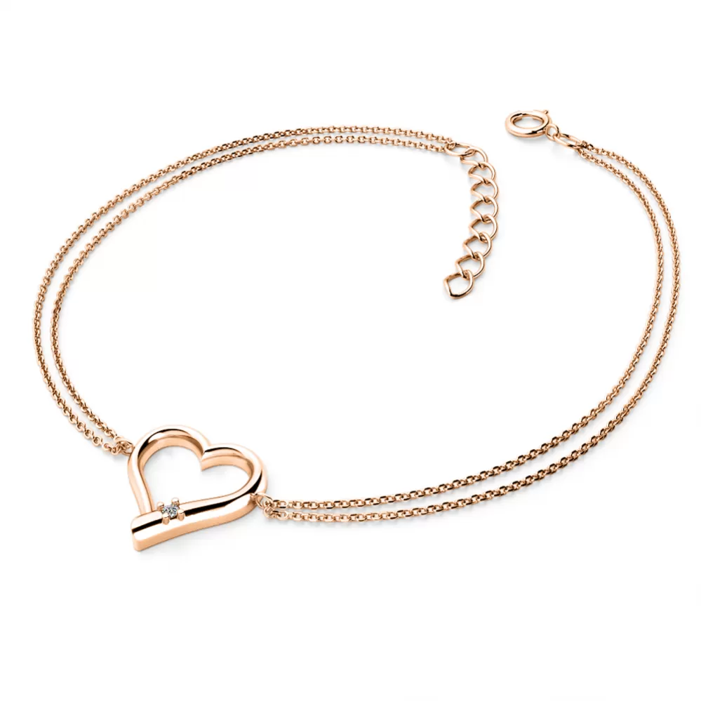 Chcete vašej milej či blízkej osobe urobiť radosť s niečím, čo nikto iný nemá? Kúpte jej tento náramok z ružového štrnásťkarátového zlata 585/1000 s diamantmi! Náramok tvorí dve spojené retiazky typu anker s lesklými facetami na každom očku a so srdiečkom uprostred. Srdce je symbolom lásky, takže ak chcete svoju milú zaujať a vyznať jej lásku, alebo svojej blízkej osobe ukázať, ako ju máte radi a záleží vám na ňu, tento náramok je presne to, čo hľadáte! V srdiečku je vsadený jeden okrúhly diamant, vybrúsený okrúhlym briliantovým brusom, ktorý zaisťuje maximálnu brilanciu vybrúsených facet zo všetkých uhlov pohľadu! Vsadzovanie diamantov vykonávajú naši najskúsenejší majstri zlatníci ručne pod mikroskopom s presnosťou na 0,01 mm a preto nehrozí vypadnutie diamantov ako to býva pri strojne vyrábaných šperkoch.