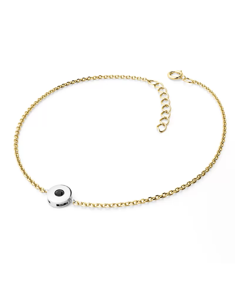 Chcete zapůsobit na vaši milou či blízkou osobu? Rozzařte jí ruku náramkem s diamantem. Tento elegantní náramek je vyroben v kombinaci bílého a žlutého čtrnáctikarátového zlata - 585/1000 v lesklé povrchové úpravě s jedním kulatým diamantem černé barvy vybroušeným briliantovým brusem. Diamant je zatepaný "na hladko" do kulaté obruby. Vsazování diamantů provádějí naši nejzkušenější mistři zlatníci ručně pod mikroskopem s přesností na 0,01mm a proto nehrozí vypadnutí kamínků jako to bývá u strojně vyráběných šperků.