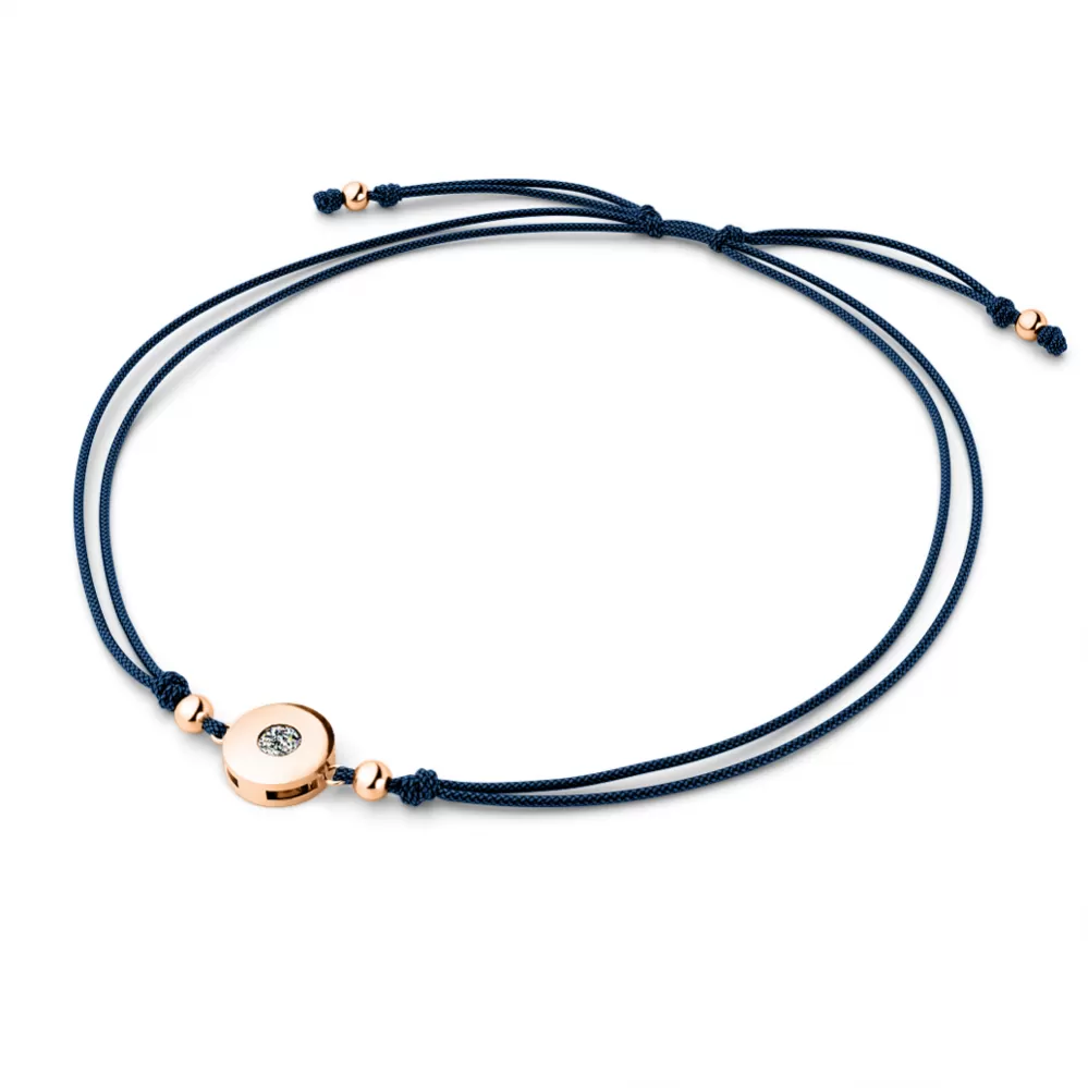Náramek kabbalah je vyroben ze šňůrky modré barvy - navy blue, kulaté ozdoby a kuliček z růžového čtrnáctikarátového zlata - 585/1000. V ozdobě je vsazen jeden kulatý diamant briliantového brusu, který zajišťuje maximální brilanci vybroušených facet diamantu, dokonale odráží světlo a krásně září z každého úhlu pohledu! Diamant je zatepaný "na hladko" přímo do ozdoby. Vsazování diamantů provádějí naši nejzkušenější mistři zlatníci ručně pod mikroskopem s přesností na 0,01mm a proto nehrozí vypadnutí kamínků jako to bývá u strojně vyráběných šperků.