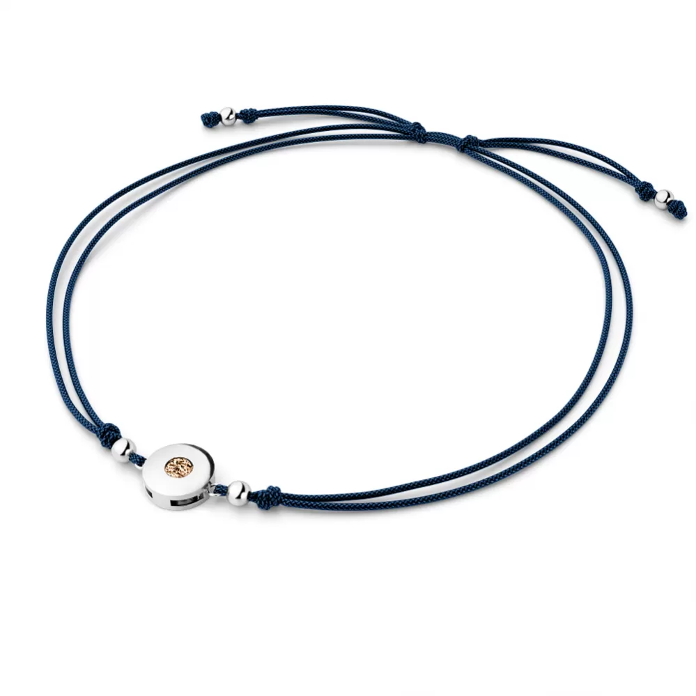 Náramek kabbalah je vyroben ze šňůrky modré barvy - navy blue, kulaté ozdoby a kuliček z bílého čtrnáctikarátového zlata - 585/1000. V ozdobě je vsazen jeden kulatý diamant barvy Champagne. Diamant je vybroušený briliantovým brusem, který zajišťuje maximální brilanci vybroušených facet diamantu, dokonale odráží světlo a krásně září z každého úhlu pohledu! Diamant je zatepaný "na hladko" přímo do ozdoby. Vsazování diamantů provádějí naši nejzkušenější mistři zlatníci ručně pod mikroskopem s přesností na 0,01mm a proto nehrozí vypadnutí kamínků jako to bývá u strojně vyráběných šperků.