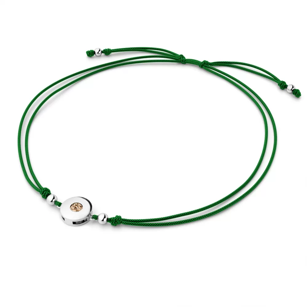 Náramek kabbalah je vyroben ze šňůrky zelené barvy, kulaté ozdoby a kuliček z bílého čtrnáctikarátového zlata - 585/1000. V ozdobě je vsazen jeden kulatý diamant barvy Champagne. Diamant je vybroušený briliantovým brusem, který zajišťuje maximální brilanci vybroušených facet diamantu, dokonale odráží světlo a krásně září z každého úhlu pohledu! Diamant je zatepaný "na hladko" přímo do ozdoby. Vsazování diamantů provádějí naši nejzkušenější mistři zlatníci ručně pod mikroskopem s přesností na 0,01mm a proto nehrozí vypadnutí kamínků jako to bývá u strojně vyráběných šperků.