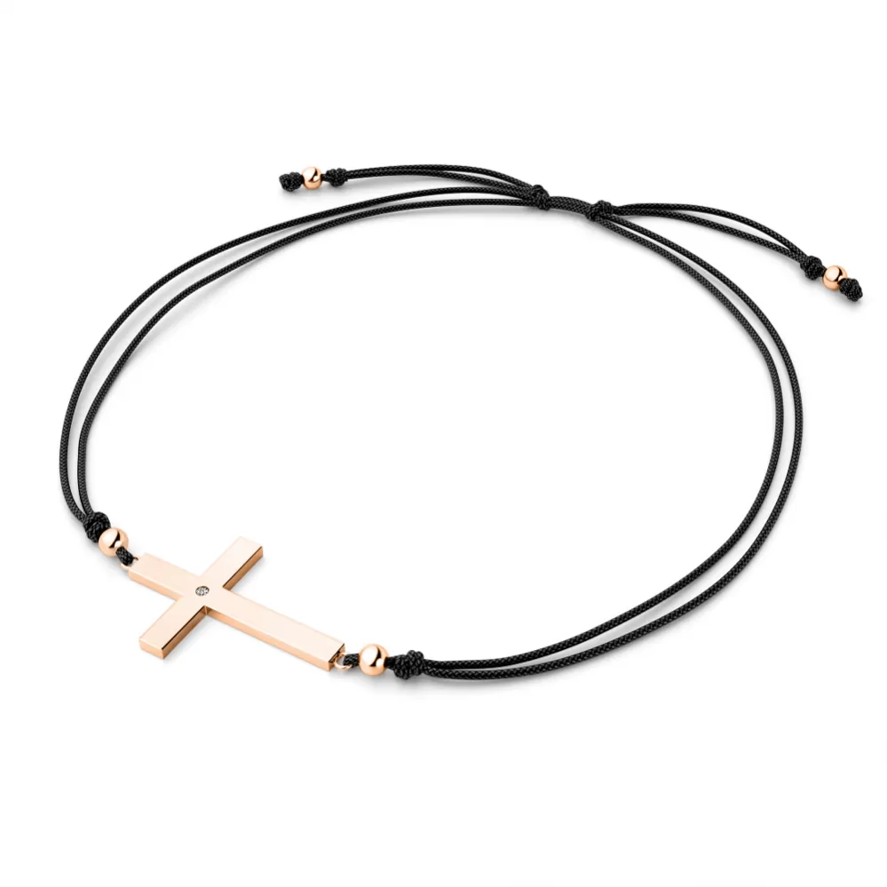 Náramek je vyroben ze šňůrky černé barvy, křížku a kuliček z růžového čtrnáctikarátového zlata - 585/1000. V křížku je vsazen jeden kulatý diamant briliantového brusu, který zajišťuje maximální brilanci vybroušených facet diamantu, dokonale odráží světlo a krásně září z každého úhlu pohledu! Diamant je zatepaný "na hladko" přímo do kříže. Vsazování diamantů provádějí naši nejzkušenější mistři zlatníci ručně pod mikroskopem s přesností na 0,01mm a proto nehrozí vypadnutí kamínků jako to bývá u strojně vyráběných šperků.