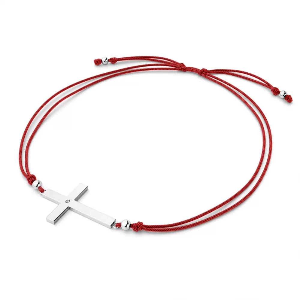 Náramek je vyroben ze šňůrky červené barvy, křížku a kuliček z bílého čtrnáctikarátového zlata - 585/1000. V křížku je vsazen jeden kulatý diamant briliantového brusu, který zajišťuje maximální brilanci vybroušených facet diamantu, dokonale odráží světlo a krásně září z každého úhlu pohledu! Diamant je zatepaný "na hladko" přímo do kříže. Vsazování diamantů provádějí naši nejzkušenější mistři zlatníci ručně pod mikroskopem s přesností na 0,01mm a proto nehrozí vypadnutí kamínků jako to bývá u strojně vyráběných šperků.
