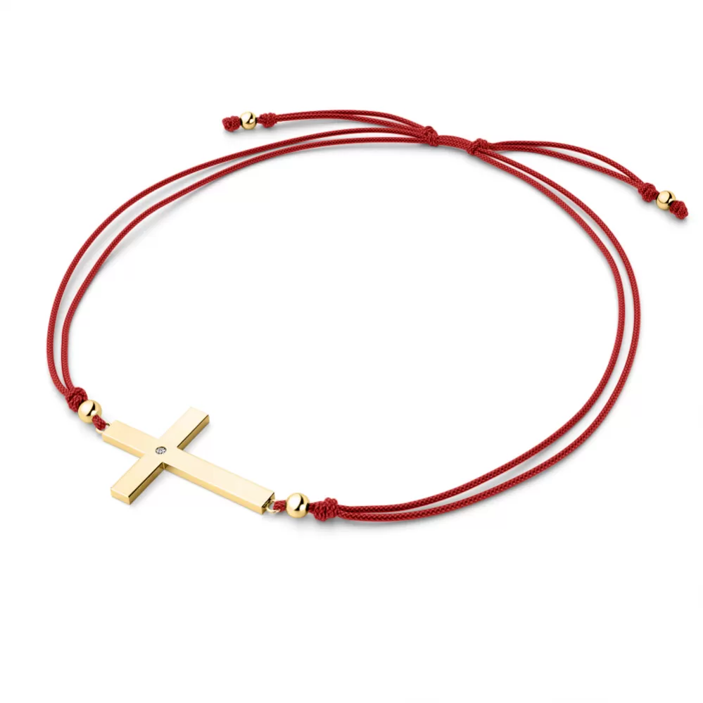Náramek je vyroben ze šňůrky červené barvy, křížku a kuliček ze žlutého čtrnáctikarátového zlata - 585/1000. V křížku je vsazen jeden kulatý diamant briliantového brusu, který zajišťuje maximální brilanci vybroušených facet diamantu, dokonale odráží světlo a krásně září z každého úhlu pohledu! Diamant je zatepaný "na hladko" přímo do kříže. Vsazování diamantů provádějí naši nejzkušenější mistři zlatníci ručně pod mikroskopem s přesností na 0,01mm a proto nehrozí vypadnutí kamínků jako to bývá u strojně vyráběných šperků.