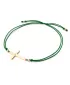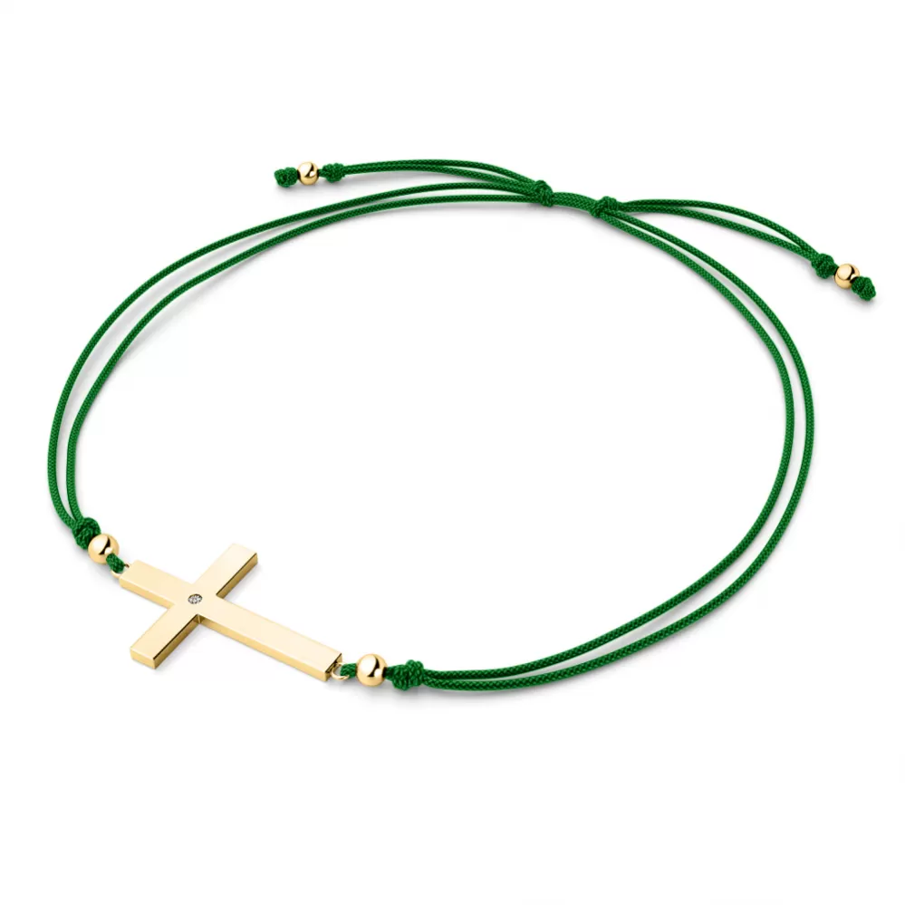 Náramek je vyroben ze šňůrky zelené barvy, křížku a kuliček ze žlutého čtrnáctikarátového zlata - 585/1000. V křížku je vsazen jeden kulatý diamant briliantového brusu, který zajišťuje maximální brilanci vybroušených facet diamantu, dokonale odráží světlo a krásně září z každého úhlu pohledu! Diamant je zatepaný "na hladko" přímo do kříže. Vsazování diamantů provádějí naši nejzkušenější mistři zlatníci ručně pod mikroskopem s přesností na 0,01mm a proto nehrozí vypadnutí kamínků jako to bývá u strojně vyráběných šperků.