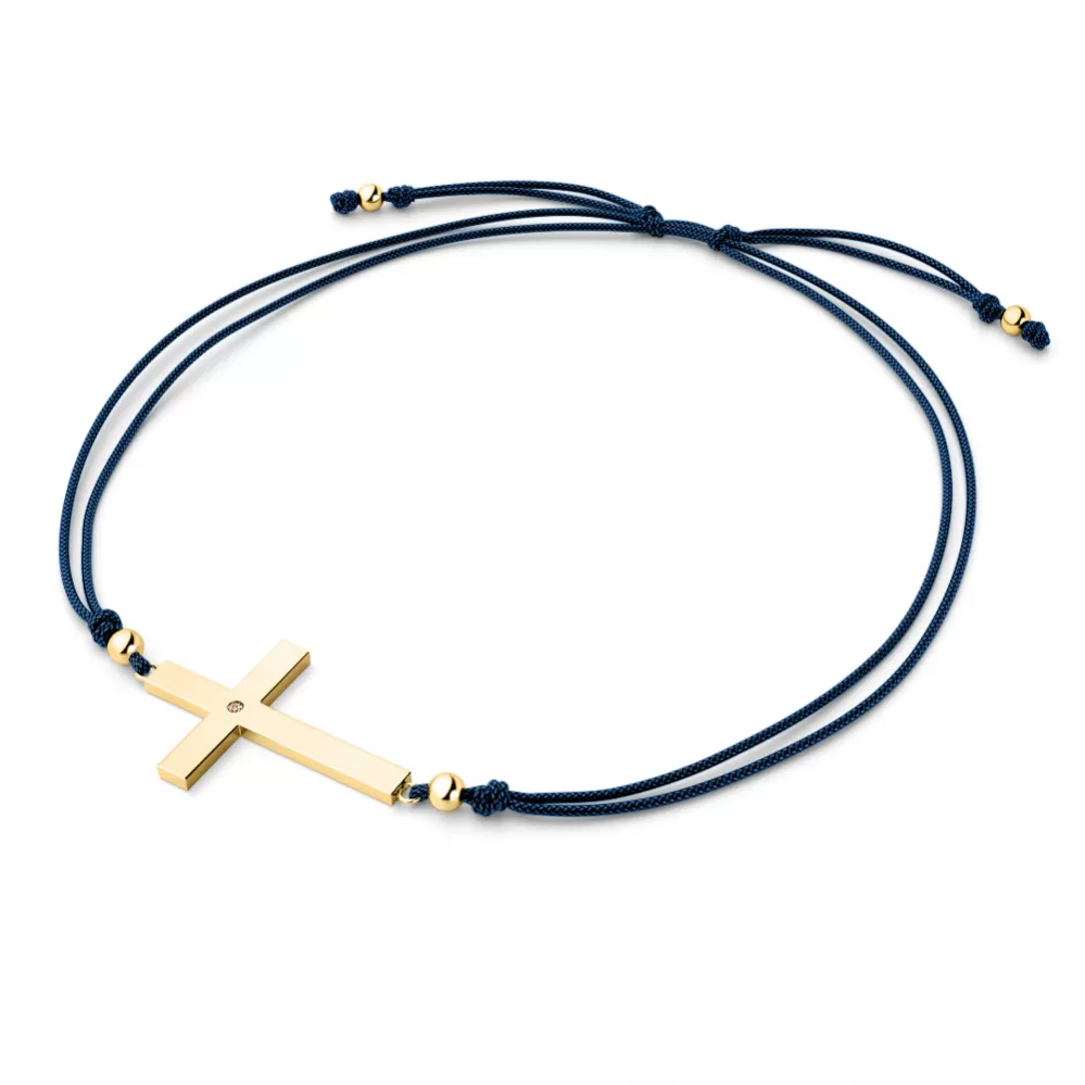 Náramek je vyroben ze šňůrky modré barvy, křížku a kuliček ze žlutého čtrnáctikarátového zlata - 585/1000. V křížku je vsazen jeden kulatý diamant barvy Champagne. Diamant je vybroušený briliantovým brusem, který zajišťuje maximální brilanci vybroušených facet, dokonale odráží světlo a krásně září z každého úhlu pohledu! Diamant je zatepaný "na hladko" přímo do kříže. Vsazování diamantů provádějí naši nejzkušenější mistři zlatníci ručně pod mikroskopem s přesností na 0,01mm a proto nehrozí vypadnutí kamínků jako to bývá u strojně vyráběných šperků.