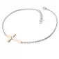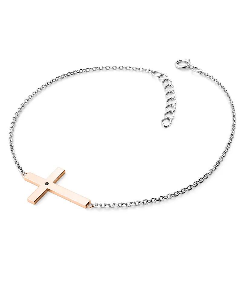 Náramek je vyroben v kombinaci bílého a růžového čtrnáctikarátového zlata - 585/1000 a tvoří ho řetízek typu anker s lesklými facetami na každém očku. Facety jsou zhotoveny diamantovým nástrojem, který dodává vzniklým facetám krásný lesk a třpyt. Uprostřed řetízku je kříž. Celý náramek je v lesklé povrchové úpravě. V křížku je vsazen jeden kulatý černý diamant briliantového brusu. Diamant je zatepaný "na hladko" přímo do kříže. Vsazování diamantů provádějí naši nejzkušenější mistři zlatníci ručně pod mikroskopem s přesností na 0,01mm a proto nehrozí vypadnutí kamínků jako to bývá u strojně vyráběných šperků.