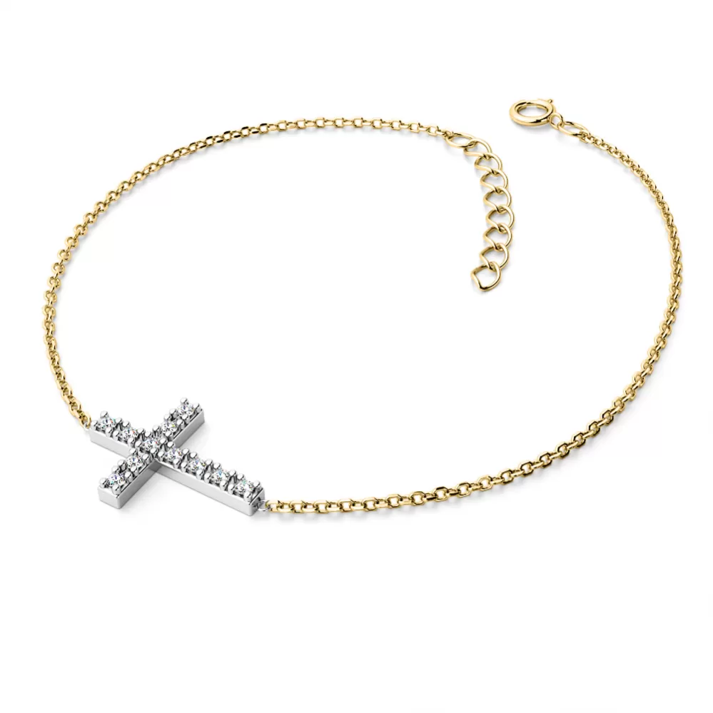 Náramok je vyrobený zo žltého az bieleho štrnásťkarátového zlata - 585/1000 a tvorí ho retiazka typu anker s lesklými facetami na každom očku. Facety sú zhotovené diamantovým nástrojom, ktorý dodáva vzniknutým facetám krásny lesk a ligot. Uprostred retiazky je kríž. Celý náramok je v lesklej povrchovej úprave. V krížiku je vsadených jedenásť okrúhlych diamantov briliantového brusu, ktorý zaisťuje maximálnu brilanciu vybrúsených facet diamantu, dokonale odráža svetlo a krásne žiari z každého uhla pohľadu! Diamanty sú vsadené do krížika pomocou krapien. Vsadzovanie diamantov vykonávajú naši najskúsenejší majstri zlatníci ručne pod mikroskopom s presnosťou na 0,01mm a preto nehrozí vypadnutie kamienkov ako to býva pri strojne vyrábaných šperkoch.