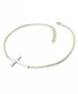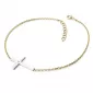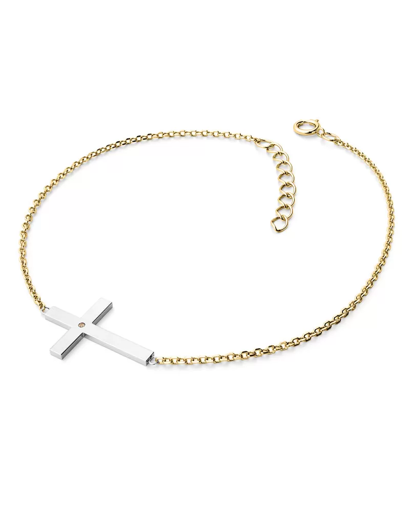 Náramek je vyroben v kombinaci žlutého a bílého čtrnáctikarátového zlata - 585/1000 a tvoří ho řetízek typu anker s lesklými facetami na každém očku. Facety jsou zhotoveny diamantovým nástrojem, který dodává vzniklým facetám krásný lesk a třpyt. Uprostřed řetízku je kříž. Celý náramek je v lesklé povrchové úpravě. V křížku je vsazen jeden kulatý diamant barvy Champagne briliantového brusu, který zajišťuje maximální brilanci vybroušených facet diamantu, dokonale odráží světlo a krásně září z každého úhlu pohledu! Diamant je zatepaný "na hladko" přímo do kříže. Vsazování diamantů provádějí naši nejzkušenější mistři zlatníci ručně pod mikroskopem s přesností na 0,01mm a proto nehrozí vypadnutí kamínků jako to bývá u strojně vyráběných šperků.