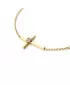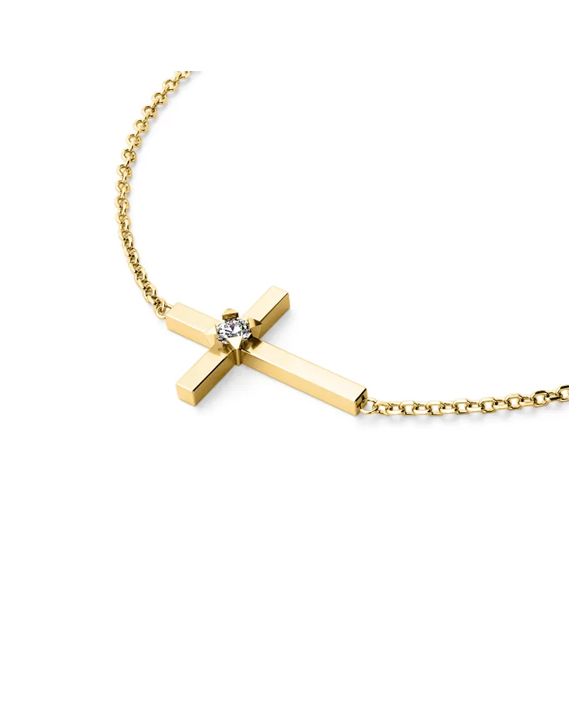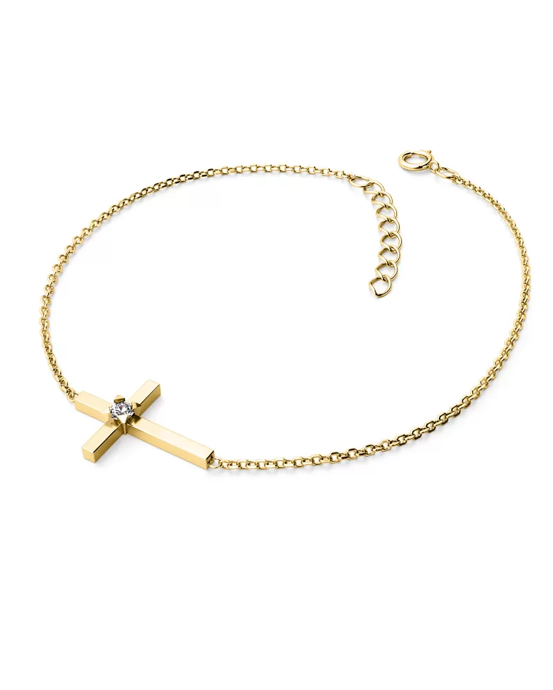 Náramek je vyrobený ze žlutého čtrnáctikarátového zlata - 585/1000 v lesklé povrchové úpravě. Skládá se z řetízku typu anker, který má facetované očka - facety - lesklé plošky jsou zhotoveny diamantovým nástrojem, který dodává vzniklým facetám maximální lesk, díky kterému dokonale odráží světlo a mají krásnou brilanci ze všech úhlů pohledu! Uprostřed náramku je křížek s jedním kulatým diamantem briliantového brusu, který zajišťuje maximální brilanci vybroušených facet. Diamant je vsazený do křížku pomocí čtyř pevných krapniček. Vsazování diamantů provádějí naši nejzkušenější mistři zlatníci ručně pod mikroskopem s přesností na 0,01mm a proto nehrozí vypadnutí kamínků jako to bývá u strojně vyráběných šperků.
