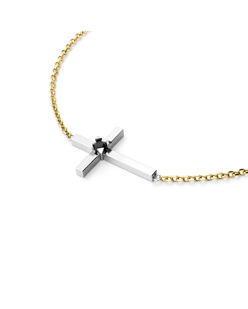 Náramek je vyrobený ze žlutého a bílého čtrnáctikarátového zlata - 585/1000 v lesklé povrchové úpravě. Skládá se z řetízku typu anker, který má facetované očka - facety - lesklé plošky jsou zhotoveny diamantovým nástrojem, který dodává vzniklým facetám maximální lesk, díky kterému dokonale odráží světlo a mají krásnou brilanci ze všech úhlů pohledu! Uprostřed náramku je křížek s jedním kulatým černým diamantem briliantového brusu. Náramek vyniká krásným kontrastem žlutého a bílého zlata a černého diamantu! Diamant je vsazený do křížku pomocí čtyř pevných krapniček. Vsazování diamantů provádějí naši nejzkušenější mistři zlatníci ručně pod mikroskopem s přesností na 0,01mm a proto nehrozí vypadnutí kamínků jako to bývá u strojně vyráběných šperků.