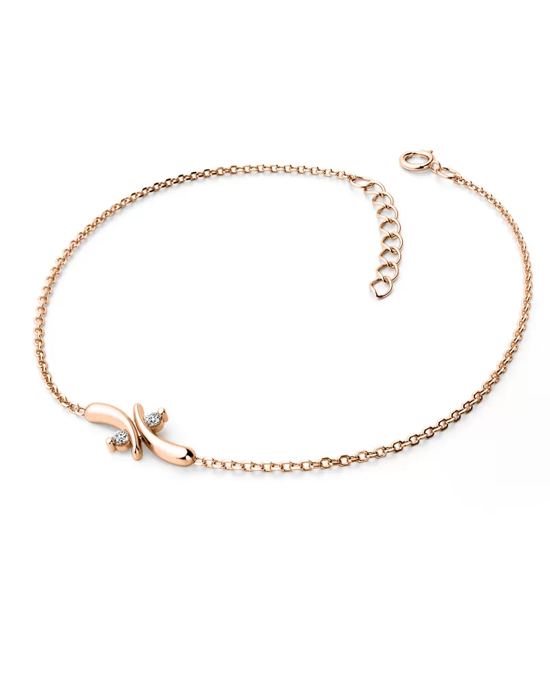 Elegantní náramek je vyroben z růžového čtrnáctikarátového zlata - 585/1000 v lesklé povrchové úpravě. Skládá se z řetízku typu anker, který má facetované očka - facety jsou zhotoveny diamantovým nástrojem, který dodává vzniklým facetám maximální lesk, díky kterému dokonale odráží světlo a mají krásnou brilanci ze všech úhlů pohledu! Uprostřed náramku je ozdoba s dvěma kulatými diamanty briliantového brusu, který zajišťuje maximální brilanci vybroušených facet. Diamanty jsou vsazeny do ozdoby pomocí pevných krapniček. Vsazování diamantů provádějí naši nejzkušenější mistři zlatníci ručně pod mikroskopem s přesností na 0,01mm a proto nehrozí vypadnutí kamínků jako to bývá u strojně vyráběných šperků.