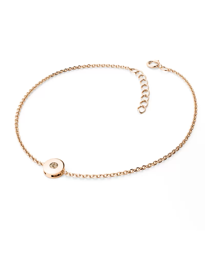 Chcete zapůsobit na vaši milou či blízkou osobu? Rozzařte jí ruku náramkem s diamantem. Tento elegantní náramek je vyroben z růžového čtrnáctikarátového zlata - 585/1000 v lesklé povrchové úpravě s jedním kulatým diamantem barvy Champagne vybroušeným briliantovým brusem, který zajišťuje maximální brilanci vybroušených facet, dokonale odráží světlo a neuvěřitelné září z každého úhlu pohledu! Diamant je zatepaný "na hladko" do kulaté obruby. Vsazování diamantů provádějí naši nejzkušenější mistři zlatníci ručně pod mikroskopem s přesností na 0,01mm a proto nehrozí vypadnutí kamínků jako to bývá u strojně vyráběných šperků.