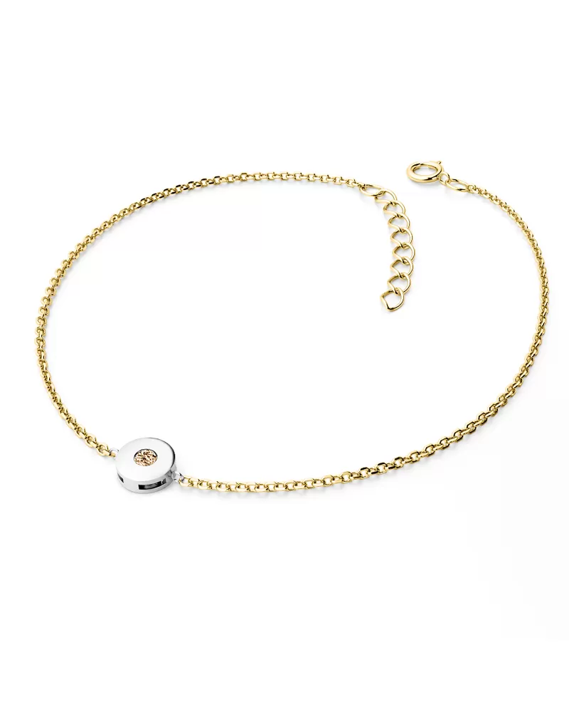 Chcete zapůsobit na vaši milou či blízkou osobu? Rozzařte jí ruku náramkem s diamantem. Tento elegantní náramek je vyroben v kombinaci žlutého a bílého čtrnáctikarátového zlata - 585/1000 v lesklé povrchové úpravě s jedním kulatým diamantem barvy Champagne vybroušeným briliantovým brusem, který zajišťuje maximální brilanci vybroušených facet, dokonale odráží světlo a neuvěřitelné září z každého úhlu pohledu! Diamant je zatepaný "na hladko" do kulaté obruby. Vsazování diamantů provádějí naši nejzkušenější mistři zlatníci ručně pod mikroskopem s přesností na 0,01mm a proto nehrozí vypadnutí kamínků jako to bývá u strojně vyráběných šperků.