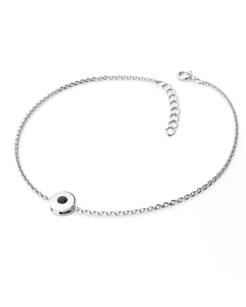 Chcete zapůsobit na vaši milou či blízkou osobu? Rozzařte jí ruku náramkem s diamantem. Tento elegantní náramek je vyroben z bílého čtrnáctikarátového zlata - 585/1000 v lesklé povrchové úpravě s jedním kulatým diamantem černé barvy vybroušeným briliantovým brusem.  Diamant je zatepaný "na hladko" do kulaté obruby. Vsazování diamantů provádějí naši nejzkušenější mistři zlatníci ručně pod mikroskopem s přesností na 0,01mm a proto nehrozí vypadnutí kamínků jako to bývá u strojně vyráběných šperků.