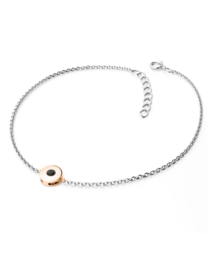 Chcete zapůsobit na vaši milou či blízkou osobu? Rozzařte jí ruku náramkem s diamantem. Tento elegantní náramek je vyroben v kombinaci růžového a bílého čtrnáctikarátového zlata - 585/1000 v lesklé povrchové úpravě s jedním kulatým diamantem černé barvy vybroušeným briliantovým brusem.  Diamant je zatepaný "na hladko" do kulaté obruby. Vsazování diamantů provádějí naši nejzkušenější mistři zlatníci ručně pod mikroskopem s přesností na 0,01mm a proto nehrozí vypadnutí kamínků jako to bývá u strojně vyráběných šperků.