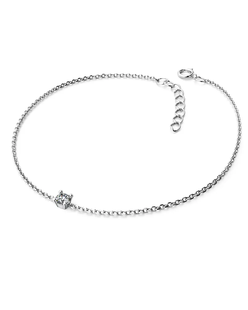 Chcete zapôsobiť na vašu milú či blízku osobu? Rozžiarte jej ruku náramkom s diamantom. Tento elegantný náramok je vyrobený z bieleho štrnásťkarátového zlata - 585/1000 v lesklej povrchovej úprave s jedným okrúhlym diamantom briliantového brusu, ktorý zaisťuje maximálnu brilanciu vybrúsených facet, dokonale odráža svetlo a neuveriteľné september z každého uhla pohľadu! Diamant je vsadený do pevnej štvorkrapňovej obruby. Vsadzovanie diamantov vykonávajú naši najskúsenejší majstri zlatníci ručne pod mikroskopom s presnosťou na 0,01mm a preto nehrozí vypadnutie kamienkov ako to býva pri strojne vyrábaných šperkoch.