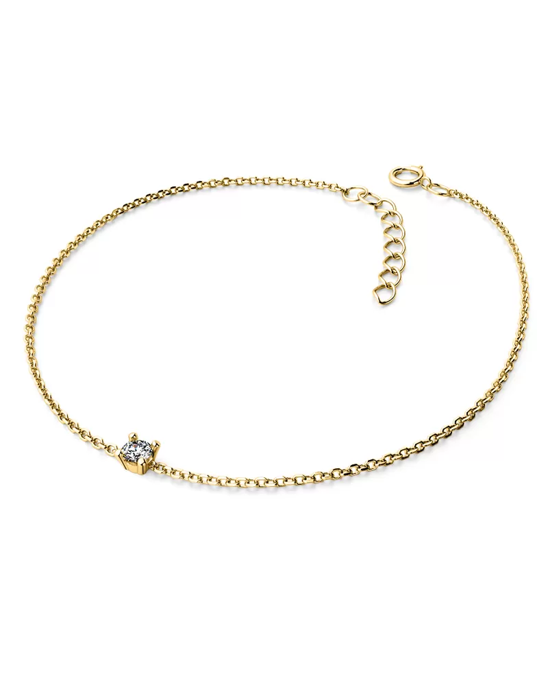 Chcete zapôsobiť na vašu milú či blízku osobu? Rozžiarte jej ruku náramkom s diamantom. Tento elegantný náramok je vyrobený zo žltého štrnásťkarátového zlata - 585/1000 v lesklej povrchovej úprave s jedným okrúhlym diamantom briliantového brusu, ktorý zaisťuje maximálnu brilanciu vybrúsených facet, dokonale odráža svetlo a neuveriteľné žiari z každého uhla pohľadu! Diamant je vsadený do pevnej štvorkrapňovej obruby. Vsadzovanie diamantov vykonávajú naši najskúsenejší majstri zlatníci ručne pod mikroskopom s presnosťou na 0,01mm a preto nehrozí vypadnutie kamienkov ako to býva pri strojne vyrábaných šperkoch.
