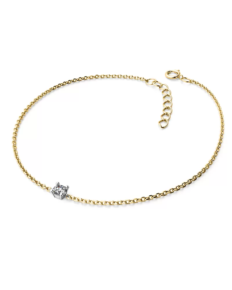 Chcete zapôsobiť na vašu milú či blízku osobu? Rozžiarte jej ruku náramkom s diamantom. Tento elegantný náramok je vyrobený v kombinácii žltého a bieleho štrnásťkarátového zlata - 585/1000 v lesklej povrchovej úprave s jedným okrúhlym diamantom briliantového brusu, ktorý zaisťuje maximálnu brilanciu vybrúsených facet, dokonale odráža svetlo a neuveriteľné žiarenie z každého uhla pohľadu. Diamant je vsadený do pevnej štvorkrapňovej obruby. Vsadzovanie diamantov vykonávajú naši najskúsenejší majstri zlatníci ručne pod mikroskopom s presnosťou na 0,01mm a preto nehrozí vypadnutie kamienkov ako to býva pri strojne vyrábaných šperkoch.