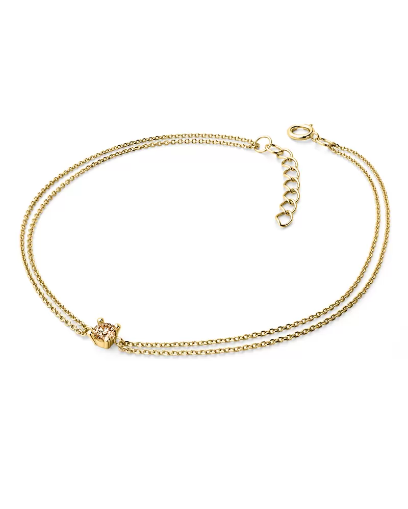 Tento elegantní náramek je vyroben z bílého čtrnáctikarátového zlata - 585/1000 v lesklé povrchové úpravě. Skládá se z dvojitého řetízku typu anker, který má facetované očka - facety jsou zhotoveny diamantovým nástrojem, který dodává vzniklým facetám maximální lesk, díky kterému dokonale odráží světlo a mají krásnou brilanci ze všech úhlů pohledu! Uprostřed řetízků je v obrubě vsazen jeden kulatý diamant barvy champagne vybroušený briliantovým brusem, který zajišťuje maximální brilanci vybroušených facet! Diamant je vsazený do pevné čtyřkrapnové obruby. Vsazování diamantů provádějí naši nejzkušenější mistři zlatníci ručně pod mikroskopem s přesností na 0,01mm a proto nehrozí vypadnutí kamínků jako to bývá u strojně vyráběných šperků.