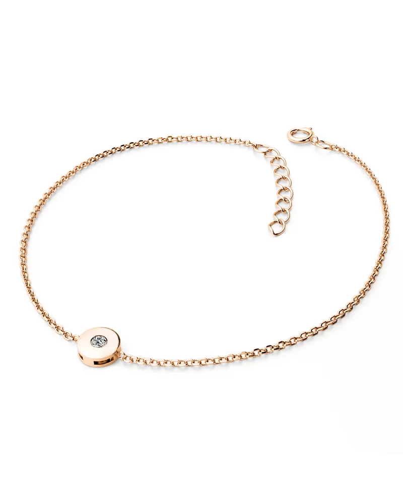 Chcete zapůsobit na vaši milou či blízkou osobu? Rozzařte jí ruku náramkem s diamantem. Tento elegantní náramek je vyroben z růžového čtrnáctikarátového zlata - 585/1000 v lesklé povrchové úpravě s jedním kulatým diamantem briliantového brusu, který zajišťuje maximální brilanci vybroušených facet, dokonale odráží světlo a neuvěřitelné září z každého úhlu pohledu! Diamant je zatepaný "na hladko" do kulaté obruby. Vsazování diamantů provádějí naši nejzkušenější mistři zlatníci ručně pod mikroskopem s přesností na 0,01mm a proto nehrozí vypadnutí kamínků jako to bývá u strojně vyráběných šperků.
