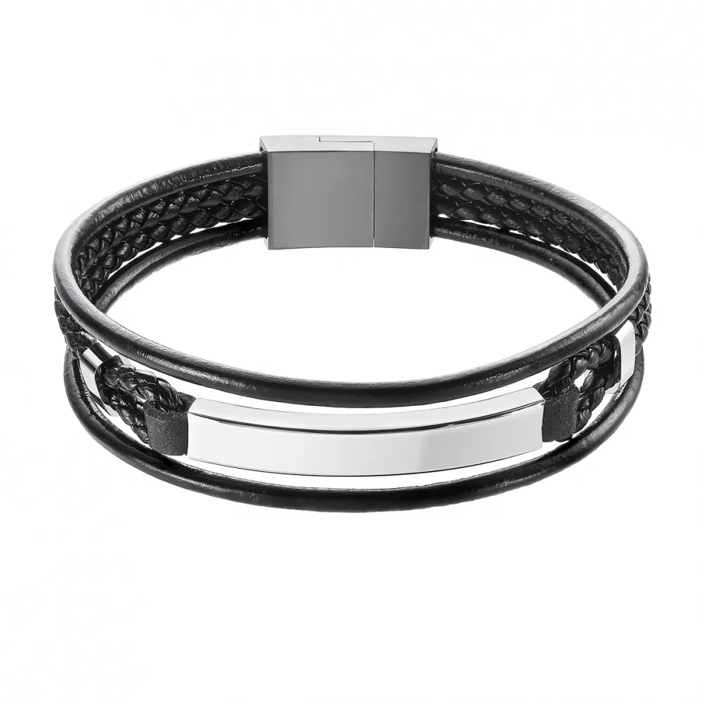 Pánsky náramok je vyrobený z rôzne tvarovaných pásikov z čiernej recyklovanej kože a koženky ozdobený oceľovým prvkom, ktorá upúta pozornosť okolia.