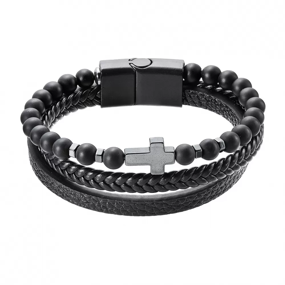 Podtrhnite svoj vzhľad luxusným pánskym náramkom s hematitom v tvare kríža! Trojitý náramok 43044.3 v čiernej farbe je vyrobený z koženkového… Celý popis