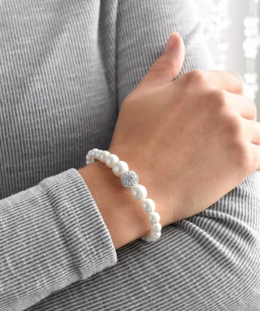 Náramok 33063.1 je navlečený z rôzne veľkých bielych perál, medzi ktoré je vložená gulička bohato vysadená Preciosa kryštálmi. Kryštály sú v bielej farbe. Náramok neobsahuje žiadny prídavok niklu, môžu ho tak bez obáv z alergickej reakcie nosiť aj alergici.
